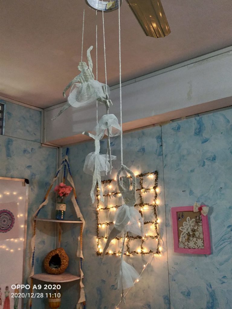 The display has all neutral colors. The combination of beige and light brown is prominent in the display. The display is a corner display where one wall is full of lace-inspired 3D flowers and another side covered full of frames that are made with Embroidery rings and lacey fabrics. The tasseled lamp is contrasting and adds to the whole look. The mannequin Is wearing an outfit that totally matches the theme and the color palette as well.