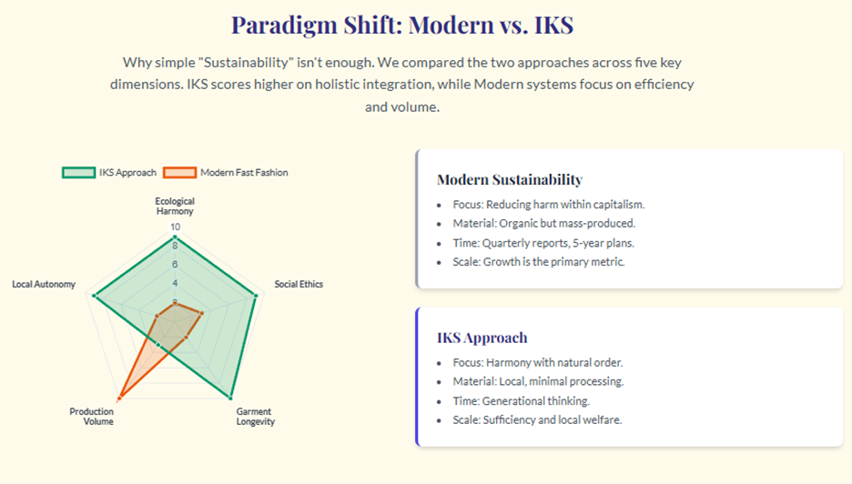 - IKS-based fashion addresses root causes (overconsumption, ecological harm) rather than symptoms, unlike many modern “sustainable” initiatives that still operate within extractive frameworks