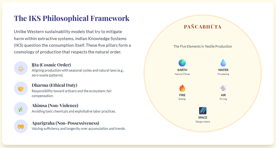 IKS (Indian Knowledge Systems) in fashion applies ancient Indian philosophical principles—Ṛta (cosmic harmony), Dharma (ethical duty), Ahimsa (non-violence), and Aparigraha (non-possessiveness)—to contemporary design. It encompasses traditional craft knowledge, sustainable materials, and production models prioritising ecological balance and artisan welfare over commercial growth.