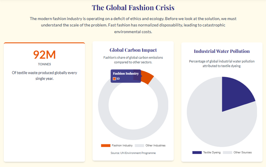 The global fashion industry produces 92 million tonnes of textile waste annually. It accounts for 10% of global carbon emissions and 20% of industrial wastewater pollution. Fast fashion has normalised buying garments worn fewer than five times before disposal.